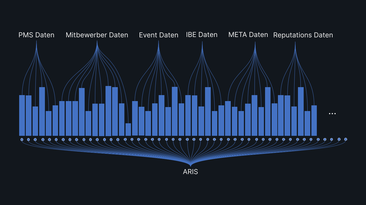 Als KI beobachtet ARIS über 1000 Datenmerkmale aus den unterschiedlichsten Bereichen, die die Performance eines Hotels beeinflussen können. Es ist dabei nicht nur die Quantität der Daten, auf die Hotellistat zugreift, sondern die Qualität, die wirklich zählt. Die Quantität stellt sicher, dass ARIS genügend Informationen hat, um Muster und Trends zu erkennen, während die Qualität garantiert, dass die Informationen genau, zuverlässig und relevant für Ihr Hotel sind.